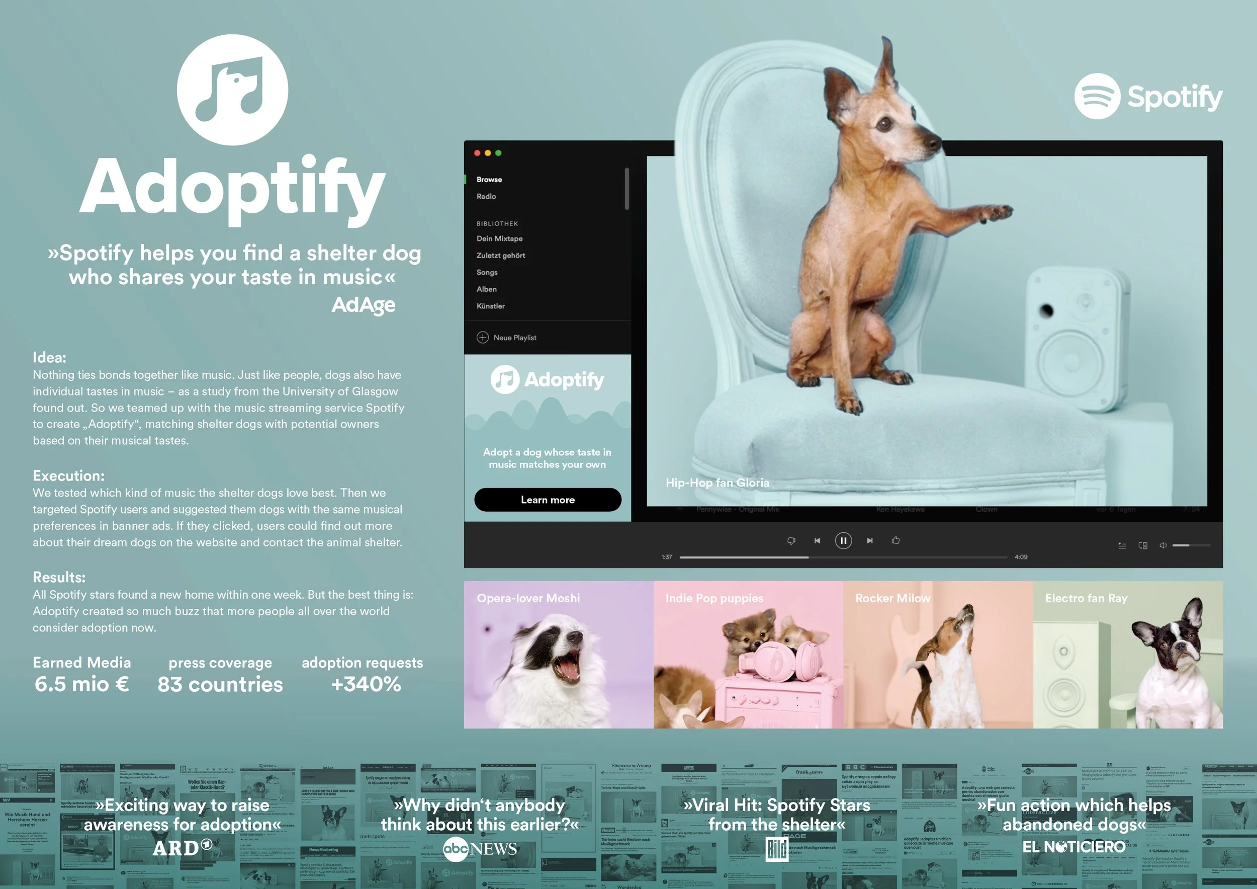 Nothing ties bonds together like music. Just like people, dogs also have individual tastes in music – as a study found out. So we teamed up with Spotify to create „Adoptify“, matching shelter dogs with potential owners based on their musical taste.
